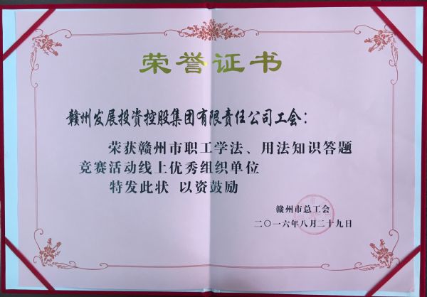 2016年7月至8月,市總工會組織開展了“全市職工學法、用法知識答題競賽”活動。集團公司工會組織員工認真學習《憲法》、《勞動法》、《工會法》、《勞動合同法》、《勞動爭議調解仲裁法》、《社會保險法》、《江西省實施<工會法>辦法》等法律法規(guī),各部門、各子公司積極參與,并推薦部分員工參加線下、線上知識答題競賽活動。日前市總工會通報表彰了優(yōu)秀組織單位和優(yōu)勝者,集團公司工會獲得“線上優(yōu)秀組織單位”,公司員工廖天茂、張強軍、江林、賴彤獲得“線上優(yōu)勝者“。
