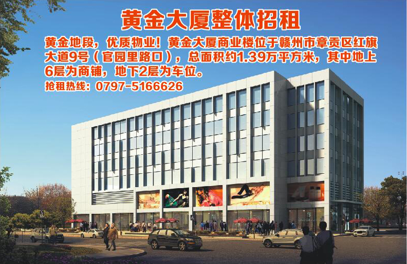 黃金大廈整體招租,黃金地段,優(yōu)質物業(yè)!黃金大廈商業(yè)樓位于贛州市章貢區(qū)紅旗大道9號(官園里路口),總面積約1.39萬平方米,其中地上6層為商鋪,地下2層為車位。