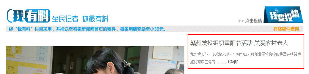 10月28日,《客家新聞網(wǎng)》“我有料”欄目刊發(fā)集團(tuán)重陽(yáng)節(jié)關(guān)愛農(nóng)村老人宣傳報(bào)道。