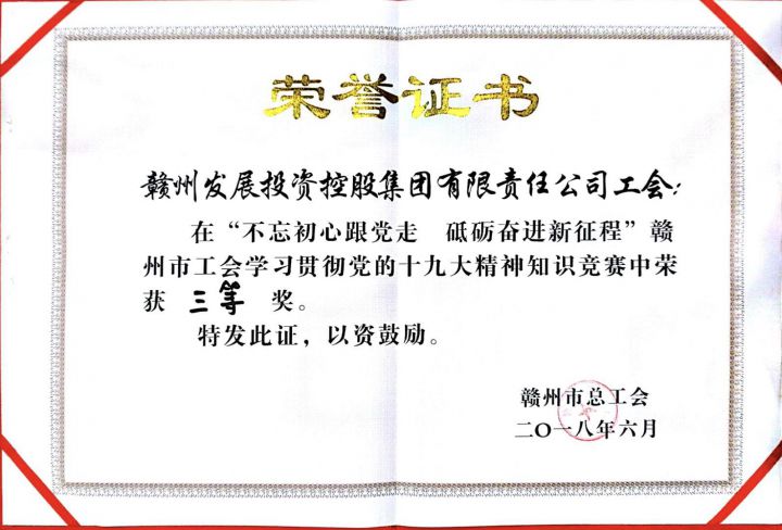 日前,集團工會積極組織廣大干部職工參與市總工會在全市工會舉辦“不忘初心跟黨走 砥礪奮進新征程”學(xué)習(xí)貫徹黨的十九大精神知識競賽。集團工會選拔出的三名選手經(jīng)過激烈的角逐獲得三等獎。集團工會還榮獲本次競賽“優(yōu)秀組織獎”。