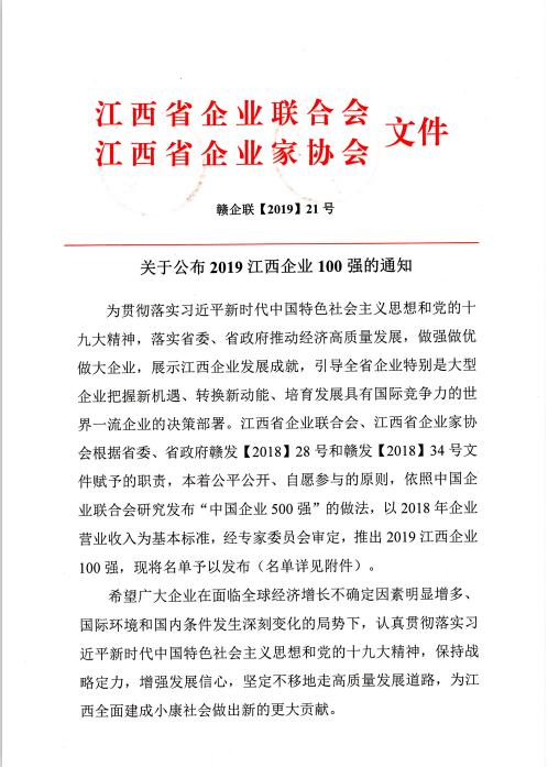 集團榮列2019江西企業(yè)100強榜單第50位