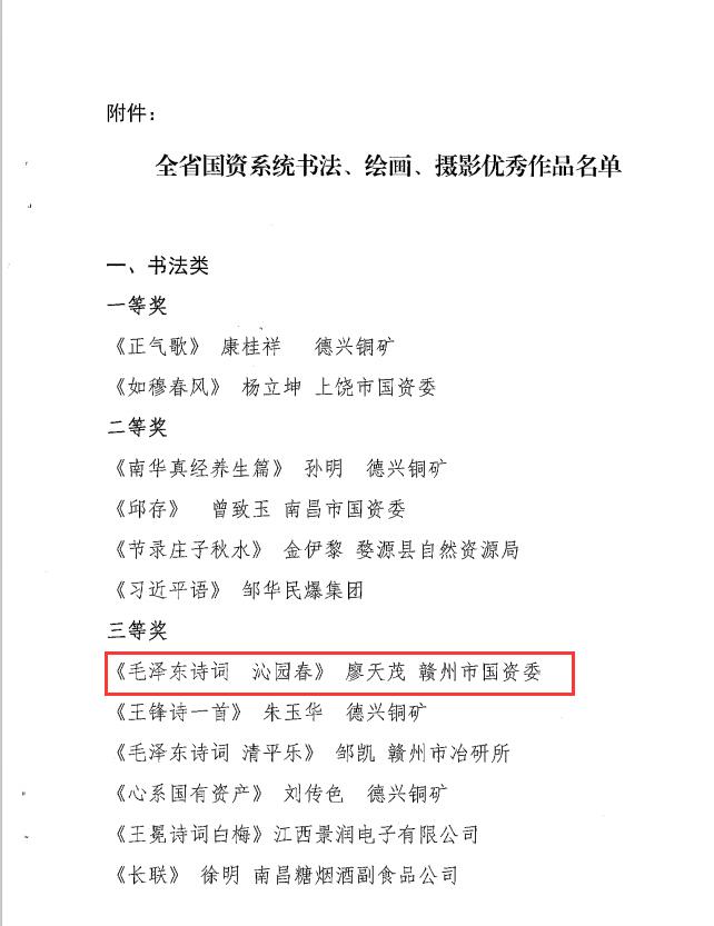 近日,江西省國資委公布了《關(guān)于全省國資系統(tǒng)書法、繪畫、攝影優(yōu)秀作品評選結(jié)果的通知》,集團(tuán)選送的書法作品——《毛澤東詩詞 沁園春》(作者:廖天茂)榮獲書法類“三等獎”。