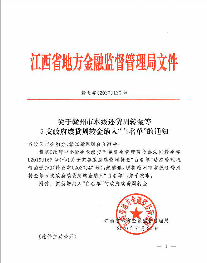 近日,江西省地方金融監(jiān)督管理局下發(fā)《關(guān)于贛州市本級還貸周轉(zhuǎn)金等5支政府續(xù)貸周轉(zhuǎn)金納入“白名單”的通知》,同意贛州發(fā)展企業(yè)還貸周轉(zhuǎn)金公司納入政府續(xù)貸周轉(zhuǎn)金“白名單”。