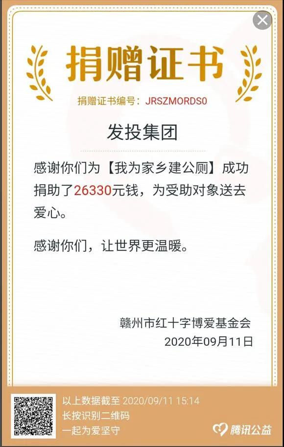 9月7日至10日,贛州發(fā)展集團(tuán)組織全體干部職工開展“我為家鄉(xiāng)建公廁”暨“99公益日”一起捐活動(dòng)。集團(tuán)每名干部、職工按照“多捐不限”的原則以及“每月捐贈(zèng)10元的工資收入或零花錢,一年捐贈(zèng)120元”的標(biāo)準(zhǔn),通過手機(jī)微信掃描騰訊公益平臺(tái)定制專屬二維碼的方式踴躍捐贈(zèng)。截止9月11日下午6時(shí),共計(jì)募捐金額26330元。