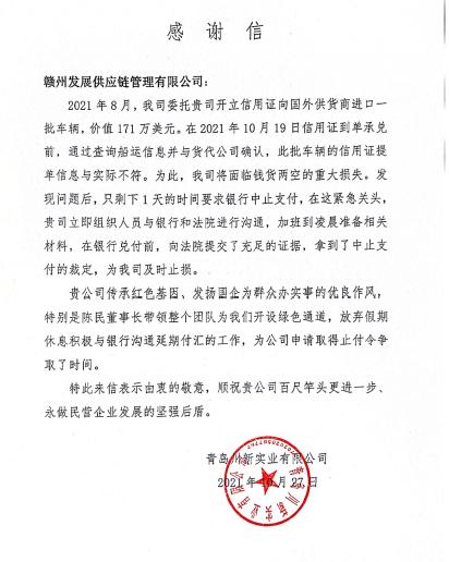 近日,贛州發(fā)展集團(tuán)旗下供應(yīng)鏈公司收到服務(wù)企業(yè)青島川新發(fā)來的一封感謝信,對供應(yīng)鏈公司為其及時挽回400余萬元經(jīng)濟(jì)損失表示感謝。