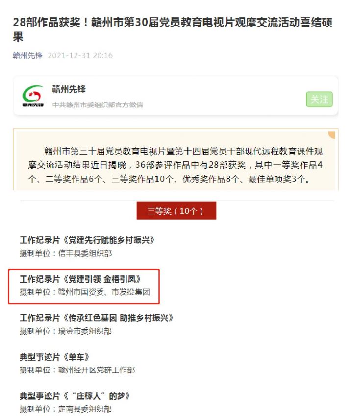 喜訊!贛州發(fā)展集團(tuán)黨建工作紀(jì)錄片獲市第30屆黨員教育電視片觀摩交流活動(dòng)三等獎(jiǎng)