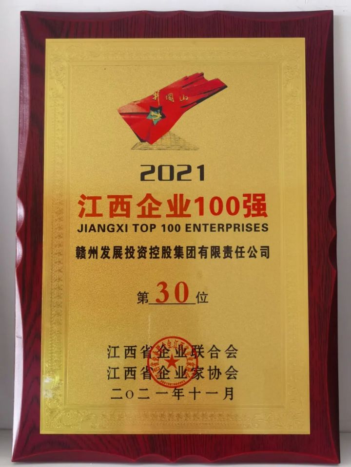 近日,贛州發(fā)展集團又添一榮譽,捧回榮譽牌,晉位至2021江西企業(yè)100強第30位。