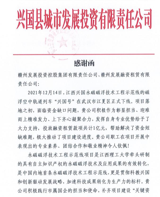近日,贛州發(fā)展集團(tuán)旗下融資租賃公司提供1億元融資租賃資金支持興國縣建成的國內(nèi)首條永磁磁懸浮空軌建成調(diào)試,空軌上的”興國號”磁浮列車已實現(xiàn)調(diào)試通車,預(yù)計7月份正式進(jìn)行通車運(yùn)營。