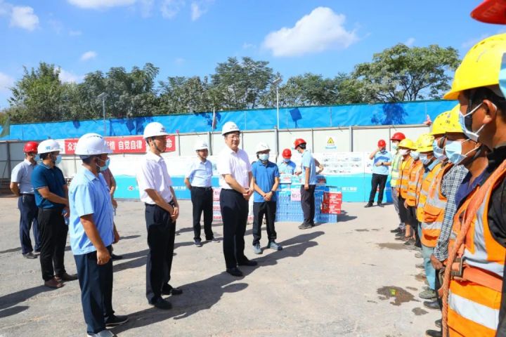 在項(xiàng)目現(xiàn)場(chǎng),胡劍飛詳細(xì)了解了項(xiàng)目基本情況、規(guī)劃設(shè)計(jì)、施工進(jìn)度以及“十一”期間生產(chǎn)安排、安全生產(chǎn)、疫情防控等情況,協(xié)調(diào)解決困難和問題??吹焦と藗冋诩泳o施工的繁忙景象,胡劍飛為一線施工人員送上了慰問品,向堅(jiān)守一線崗位的廣大勞動(dòng)者致以節(jié)日的問候。他強(qiáng)調(diào),要搶抓項(xiàng)目施工黃金期,爭(zhēng)分奪秒趕進(jìn)度,在保障項(xiàng)目質(zhì)量和安全、疫情防控的前提下,進(jìn)一步加快項(xiàng)目建設(shè)步伐,確保項(xiàng)目如期完工。