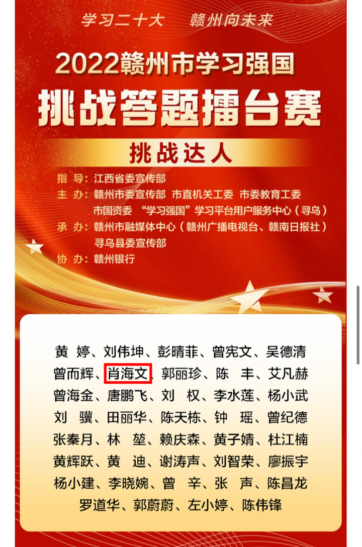在此次比賽中,市國資委代表隊(duì)獲得團(tuán)體三等獎,贛州發(fā)展集團(tuán)肖海文被選派代表市國資系統(tǒng)參加全市總決賽并獲得個人三等獎以及“挑戰(zhàn)達(dá)人”稱號。此前,肖海文曾獲得2022年度贛州市國資系統(tǒng)“學(xué)習(xí)強(qiáng)國”知識競賽個人一等獎。