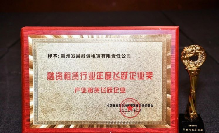 近日,“2022中國融資租賃總經(jīng)理高峰論壇金鼎獎頒獎盛典”在上海隆重舉行!贛州發(fā)展集團(tuán)旗下融資租賃公司憑借企業(yè)聲譽(yù)、綜合實(shí)力和行業(yè)影響力榮獲融資租賃行業(yè)年度飛躍企業(yè)獎之“產(chǎn)業(yè)租賃飛躍企業(yè)”獎項(xiàng)。