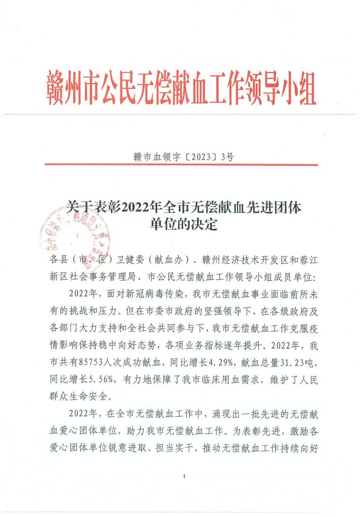6月6日,贛州市公民無償獻(xiàn)血工作領(lǐng)導(dǎo)小組印發(fā)《關(guān)于表彰2022年全市無償獻(xiàn)血先進(jìn)團(tuán)體單位的決定》(贛市血領(lǐng)字[2023]3號(hào)),贛州發(fā)展集團(tuán)被評(píng)為“2022 年度贛州市無償獻(xiàn)血先進(jìn)團(tuán)體單位”。