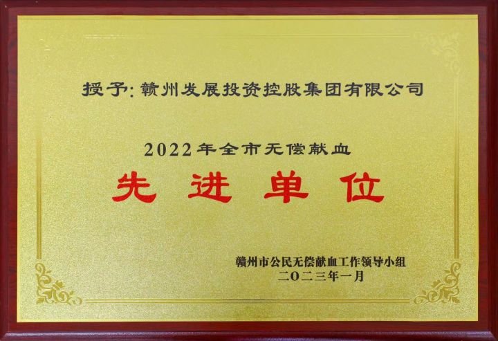 喜訊!贛州發(fā)展集團(tuán)被評(píng)為“2022年度贛州市無償獻(xiàn)血先進(jìn)團(tuán)體單位”