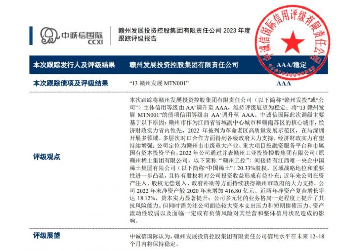 重磅!贛州發(fā)展投資控股集團(tuán)喜獲中誠信AAA主體信用評(píng)級(jí)