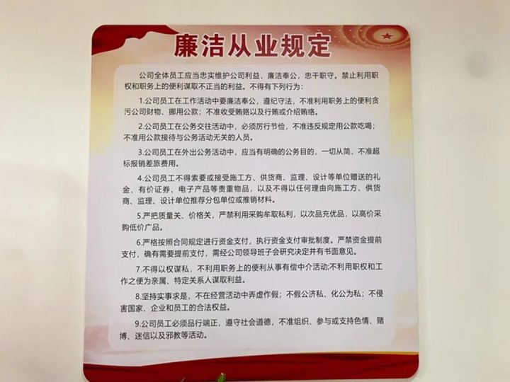 嚴(yán)格落實各項責(zé)任。支部嚴(yán)格落實黨風(fēng)廉政建設(shè)主體責(zé)任和監(jiān)督責(zé)任,支委會至少每半年專題研究1次黨風(fēng)廉政建設(shè)和反腐敗斗爭工作,與全體黨員、員工簽訂了黨風(fēng)廉政建設(shè)責(zé)任書,對黨風(fēng)廉政建設(shè)工作實行層級管理,做到一級抓一級,層層抓落實。注重廉政學(xué)習(xí)宣傳。通過支委會、員工大會、黨員大會等深入學(xué)習(xí)黨的二十大精神、黨章、法律法規(guī)及黨風(fēng)廉政建設(shè)新要求,筑牢廣大黨員員工思想防線。集中購置了黨紀(jì)、法律法規(guī)、廉政文化讀本等書籍,建設(shè)了“廉潔書屋”,同時在公司辦公場所走廊設(shè)置了廉政文化宣傳欄,豐富了廉潔文化陣地,營造了“學(xué)廉、尊廉、崇廉、愛廉”濃厚氛圍。持續(xù)開展警示教育。支部常態(tài)化開展違法違紀(jì)案例通報,每季度開展專題警示教育1次、廉政談話1次、講授黨風(fēng)廉政建設(shè)專題黨課1次,每逢節(jié)假日提前向黨員員工發(fā)送廉潔提醒,定期開展廉政家訪,將黨風(fēng)廉政建設(shè)和反腐敗要求傳導(dǎo)到每一名干部、黨員,引導(dǎo)廣大黨員干部提高拒腐防變的能力。