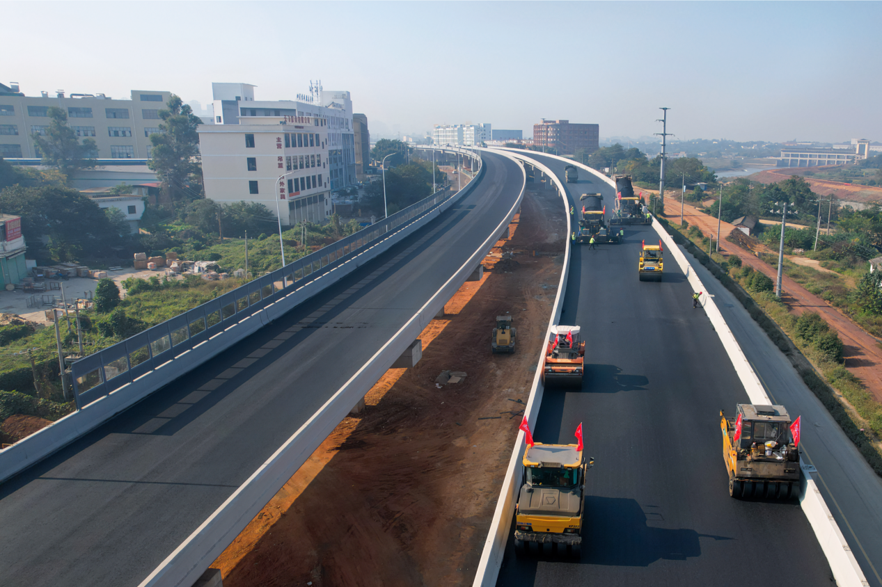 贛南大道快速路Ⅳ標(龍嶺西路至創(chuàng)勝路東側(cè)段)項目瀝青攤鋪全長約5.68km,總鋪設(shè)面積約13.3萬平方米。截止目前,已累計完成總工程量的77%,主線橋梁工程完成100%。下一步,項目將重點推進伸縮縫、聲屏障、橋面照明、交通設(shè)施等橋面系及橋面附屬施工,為實現(xiàn)2023年底項目主線高架橋通車目標全力沖刺。
