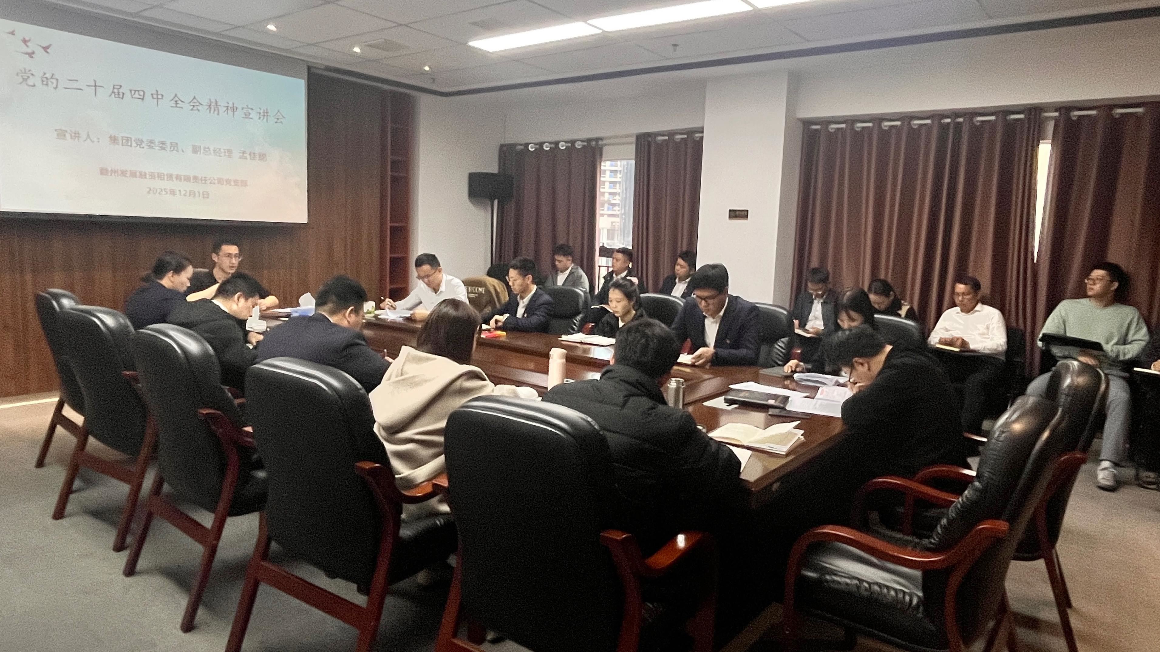 12月1日,為深入學(xué)習(xí)貫徹黨的二十屆四中全會精神,贛州發(fā)展集團(tuán)黨委委員、副總經(jīng)理孟佳聰赴掛點(diǎn)聯(lián)系的贛州發(fā)展融資租賃有限責(zé)任公司黨支部開展專題宣講。租賃公司黨支部全體黨員、職工、集團(tuán)黨群工作部有關(guān)人員參加宣講會。