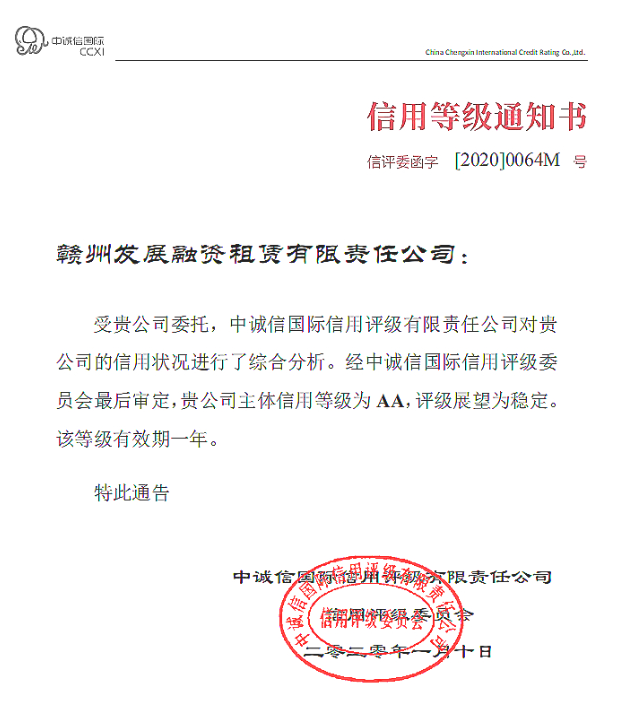 日前,經(jīng)中誠(chéng)信國(guó)際信用評(píng)級(jí)有限責(zé)任公司信用評(píng)審委員會(huì)審定,評(píng)定贛州發(fā)展融資租賃有限責(zé)任公司(下稱“贛發(fā)租賃”)主體信用等級(jí)為AA,評(píng)級(jí)展望為穩(wěn)定。這是贛發(fā)租賃成立以來(lái)的首次外部評(píng)級(jí),也是江西省首家融資租賃企業(yè)獲此評(píng)級(jí)的國(guó)企,標(biāo)志著權(quán)威評(píng)級(jí)機(jī)構(gòu)對(duì)贛發(fā)租賃綜合實(shí)力的認(rèn)可。